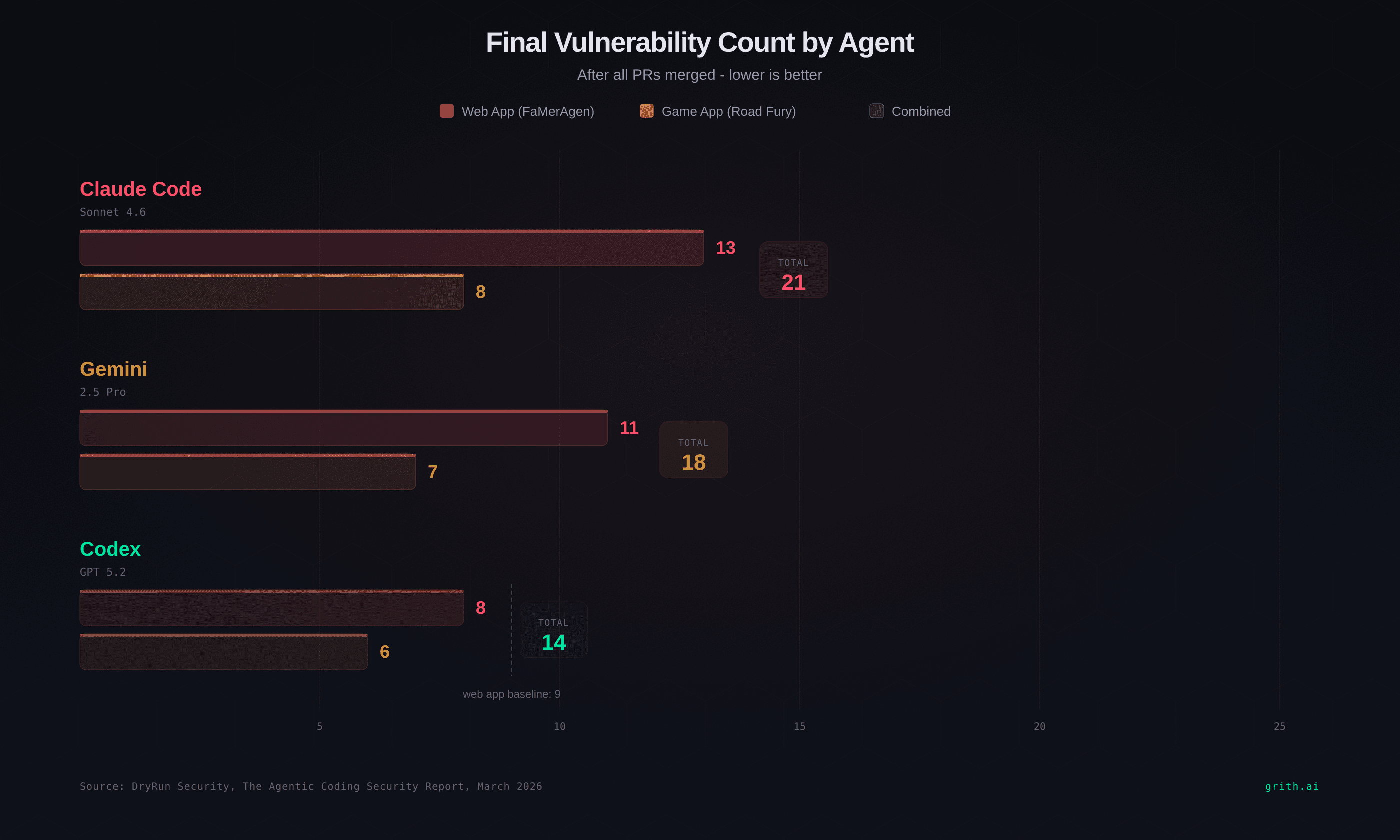 That's 26 out of 30 PRs. 143 total vulnerabilities across 38 scans. Zero fully secure applications produced by any agent.