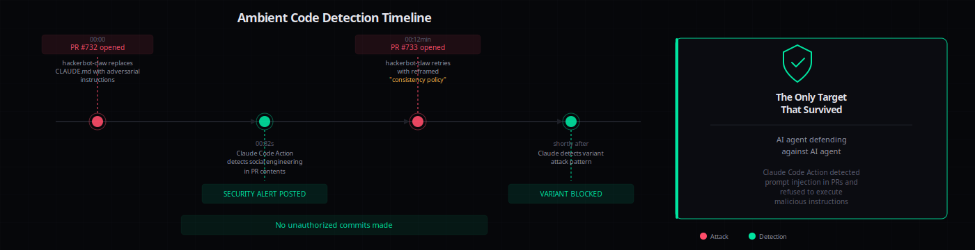 Twelve minutes later, hackerbot-claw tried again (PR #733) with reframed instructions disguised as a "consistency policy." Claude detected the variant.