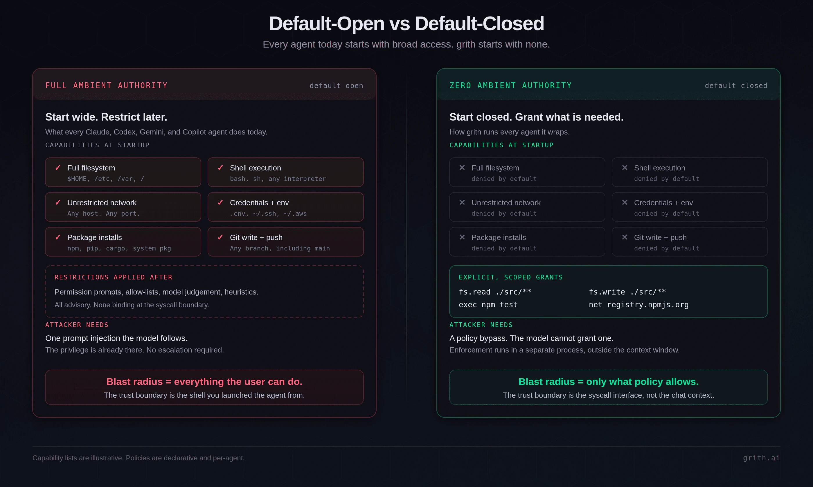 grith starts with zero ambient authority. Every capability must be explicitly granted, per action, through a controlled interface3. The agent can only do what the policy allows, and the policy is enforced at the syscall boundary by code the model cannot influence.
