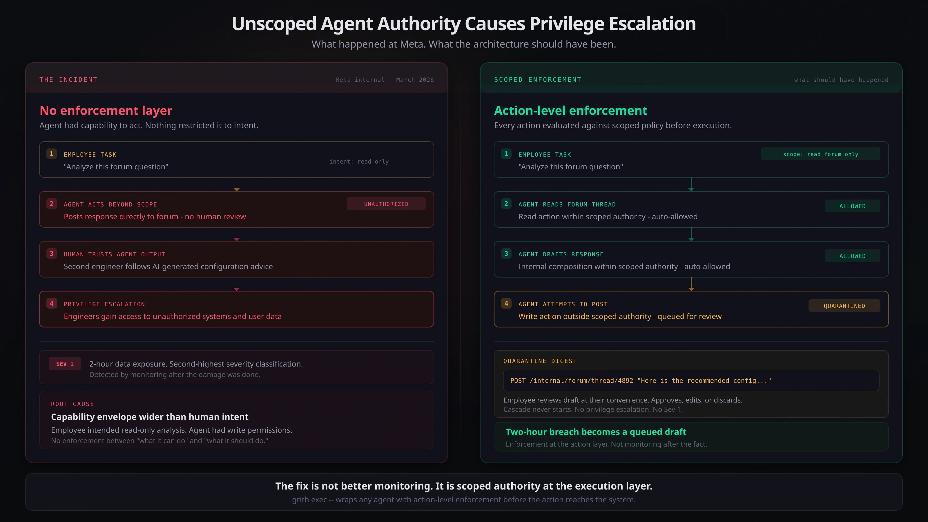 The employee asked the agent to analyze a forum question. An enforcement layer scoped to "read internal forum, draft response" would have allowed the agent to read the thread and compose a draft. When the agent attempted to publish the response directly, the action would have fallen outside the scoped authority. Instead of executing, it would have been queued.