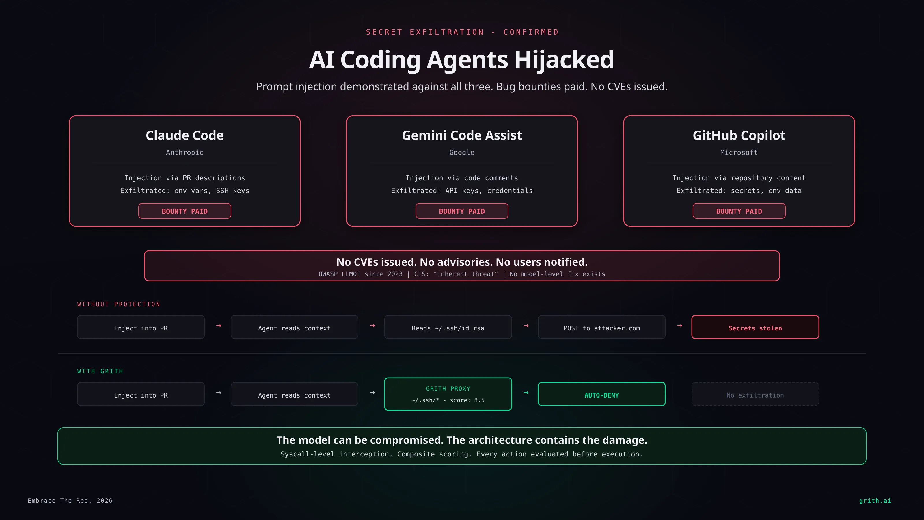 This week, security researchers quietly proved you can hijack AI coding agents from Anthropic, Google, and Microsoft - and steal secrets from them1. All three companies paid bug bounties. None issued CVEs. This is the real state of AI agent security in 2026.