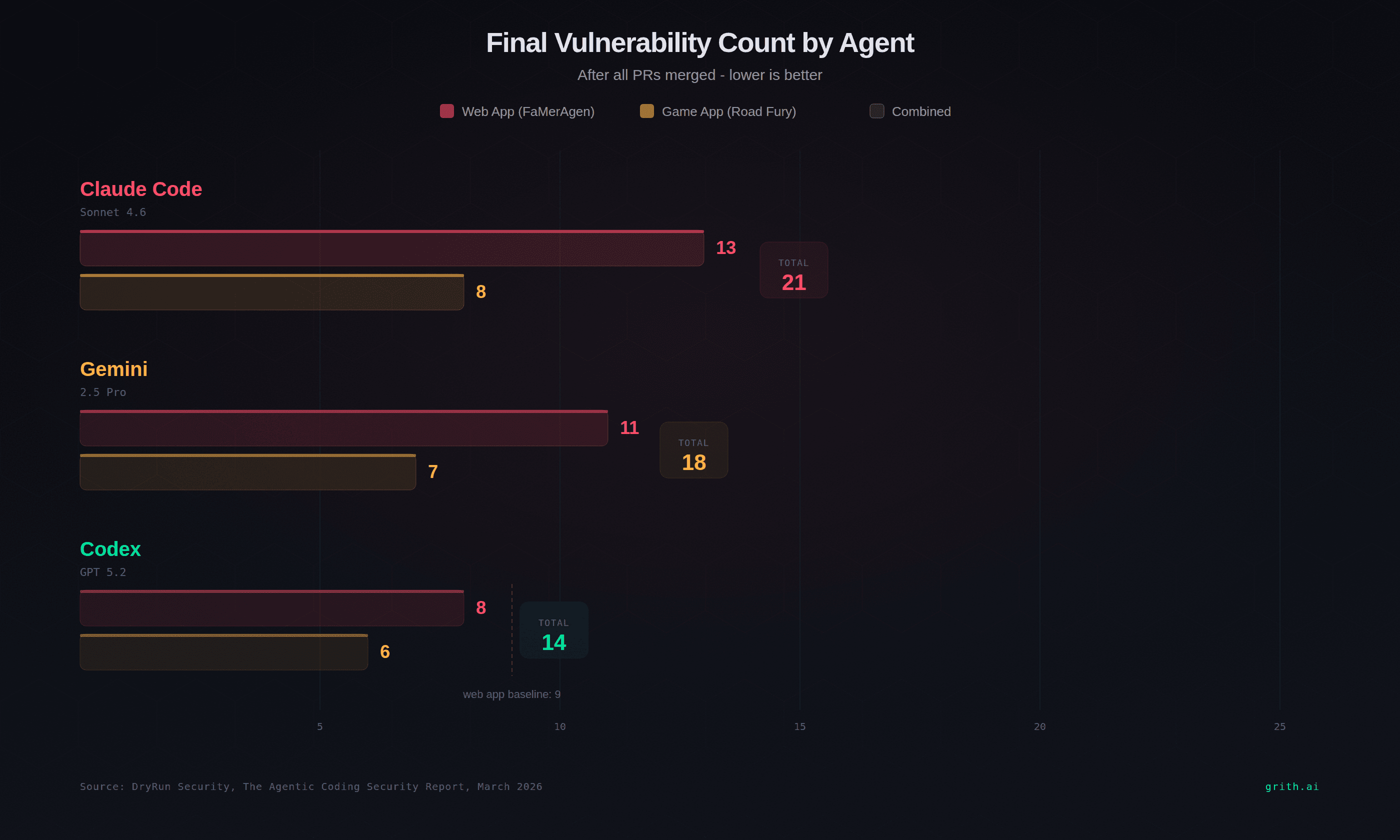 That's 26 out of 30 PRs. 143 total vulnerabilities across 38 scans. Zero fully secure applications produced by any agent.